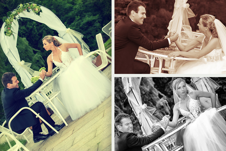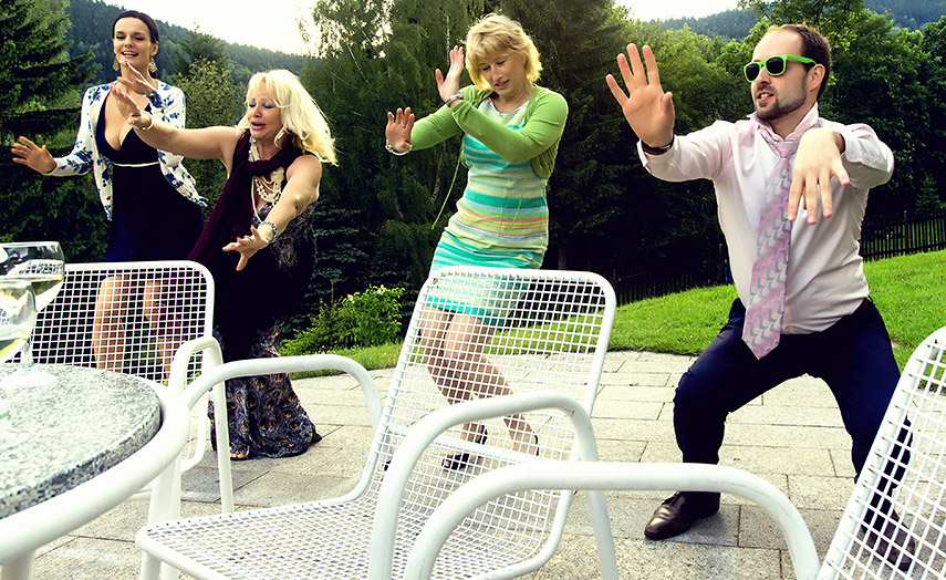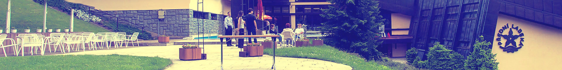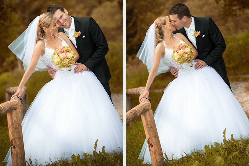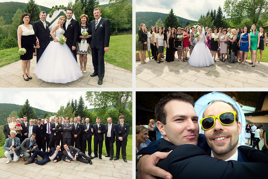 Zotavovna Přední Labská je rekreačním zařízením pro zaměstnance Vězeňské služby a Ministerstva vnitra. Kromě velice pestrých programů pro hosty (doporučuji navštívit web tohoto krkonošského komplexu a zvláště fotogalerii) je zde možné uspořádat celou svatbu s obřadem, hostinou i ubytováním. V našem případě se svatební obřad odehrál přímo před budovou, kde vznikl improvizovaný stůl a nakonec jsme tu nafotili i společnou fotografii a skupinky. Fotografie novomanželů však vznikly i na jiném místě, kam jsme dojeli autem cca 5 minut nad hotelovou budovu. Vystačili jsme si se zvoničkou a dřevěnnou ohradou na rozcestí, kde vznikla drtivá většina snímků a po návratu jsme zbytek fotografií nafotili mezi budovami - na dětské houpačce a u bazénu. Nevěsta patřila k těm, které nepotřebují vedení svatebního fotografa, stačily jí obecné pokyny a pohybovala se přirozeně nejen ona, nýbrž i její manžel, který se jí přizpůsoboval. Vše tedy probíhalo v pohodě, času bylo dost, nikam jsme nespěchali a protože později novomanželé odjeli na dlouhou a výpravnou svatební cestu, byl dostatek času i na výraznější finální sofwarové úpravy. Posuďte sami, jak vše dopadlo...